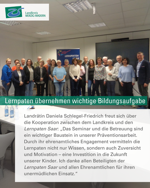 Mit der Übergabe der Zertifikate durch Landrätin Daniela Schlegel-Friedrich, den Stiftungsvorsitzenden Dr. Christian Molitor und den Lernpaten-Projektleiter, Hans Joachim Müller, ist der 25.Qualifizierungslehrgang für die Lernpaten Saar, diesmal mit Unterstützung des Jugendamtes des Landkreis-Merzig-Wadern zu Ende gegangen. 22 neue Lernpaten werden mit viel Vorfreude jetzt ihren Einsatz an Schulen im Landkreis beginnen.