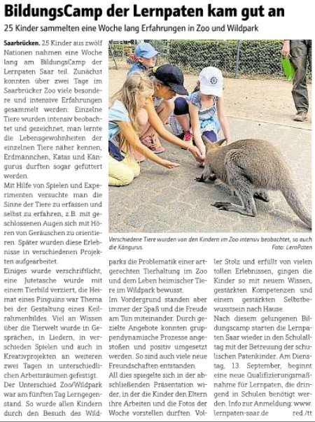 25 Kinder aus insgesamt 12 Nationen nahmen eine Woche lang an diesem besonderen Ereignis teil. Zunächst konnten über 2 Tage im Saarbrücker Zoo viele besondere und intensive Erfahrungen gemacht werden: Einzelne Tiere wurden intensiv beobachtet und gezeichnet, man lernte die Lebensgewohnheiten der einzelnen Tiere näher kennen, Erdmännchen, Katas und Kängurus durften sogar gefüttert werden. Mit Hilfe von Spielen und Experimentenversuchte man die Sinne der Tiere zu erfassen und selbst zu erfahren, z.B. mit geschlossenen Augen (Dunkelheit) sich mit Hören von Geräuschen zu orientieren.
